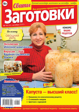 Более 100 рецептов заготовок от Сватов в каждом номере: соленья и маринады, салаты и ассорти, соусы и приправы, заготовки к сезону, сладкие заготовки, напитки, винный погребок, мясные деликатесы, здоровые рецепты, целебные заготовки, дачные хлопоты, правила хранения, а также кроссворды и сканворды для досуга. Лучшими рецептами поделятся с вами сваты Любовь Сергеевна и Михаил Михайлович.