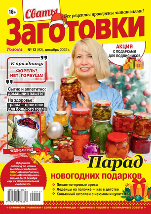 Более 100 рецептов заготовок от Сватов в каждом номере: соленья и маринады, салаты и ассорти, соусы и приправы, заготовки к сезону, сладкие заготовки, напитки, винный погребок, мясные деликатесы, здоровые рецепты, целебные заготовки, дачные хлопоты, правила хранения, а также кроссворды и сканворды для досуга. Лучшими рецептами поделятся с вами сваты Любовь Сергеевна и Михаил Михайлович.