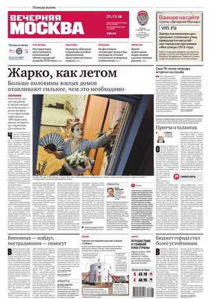 «Вечерняя Москва» — ежедневная российская вечерняя газета, старейшее из вечерних изданий в России, учрежденное в 1923 году. Выходит пять дней в неделю, кроме субботы и воскресенья. Отличается тем, что рассказывает о событиях еще не завершившегося дня. Оперативно освещает хронику и особенности жизни Москвы, охватывает все слои общества и большинство профессиональных и возрастных групп читателей.Издание представлено тремя выпусками – утренним ежедневным, вечерним (выходит три раза в неделю), еженедельным (выходит по четвергам).