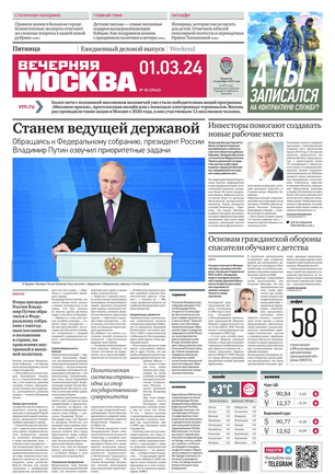 «Вечерняя Москва» — ежедневная российская вечерняя газета, старейшее из вечерних изданий в России, учрежденное в 1923 году. Выходит пять дней в неделю, кроме субботы и воскресенья. Отличается тем, что рассказывает о событиях еще не завершившегося дня. Оперативно освещает хронику и особенности жизни Москвы, охватывает все слои общества и большинство профессиональных и возрастных групп читателей.Издание представлено тремя выпусками – утренним ежедневным, вечерним (выходит три раза в неделю), еженедельным (выходит по четвергам).