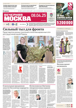 «Вечерняя Москва» — ежедневная российская вечерняя газета, старейшее из вечерних изданий в России, учрежденное в 1923 году. Выходит пять дней в неделю, кроме субботы и воскресенья. Отличается тем, что рассказывает о событиях еще не завершившегося дня. Оперативно освещает хронику и особенности жизни Москвы, охватывает все слои общества и большинство профессиональных и возрастных групп читателей.Издание представлено тремя выпусками – утренним ежедневным, вечерним (выходит три раза в неделю), еженедельным (выходит по четвергам).
