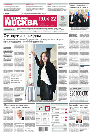 «Вечерняя Москва» — ежедневная российская вечерняя газета, старейшее из вечерних изданий в России, учрежденное в 1923 году. Выходит пять дней в неделю, кроме субботы и воскресенья. Отличается тем, что рассказывает о событиях еще не завершившегося дня. Оперативно освещает хронику и особенности жизни Москвы, охватывает все слои общества и большинство профессиональных и возрастных групп читателей.Издание представлено тремя выпусками – утренним ежедневным, вечерним (выходит три раза в неделю), еженедельным (выходит по четвергам).