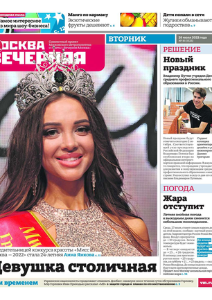 «Вечерняя Москва» — ежедневная российская вечерняя газета, старейшее из вечерних изданий в России, учрежденное в 1923 году. Выходит пять дней в неделю, кроме субботы и воскресенья. Отличается тем, что рассказывает о событиях еще не завершившегося дня. Оперативно освещает хронику и особенности жизни Москвы, охватывает все слои общества и большинство профессиональных и возрастных групп читателей.Издание представлено тремя выпусками – утренним ежедневным, вечерним (выходит три раза в неделю), еженедельным (выходит по четвергам).