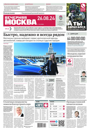 «Вечерняя Москва» — ежедневная российская вечерняя газета, старейшее из вечерних изданий в России, учрежденное в 1923 году. Выходит пять дней в неделю, кроме субботы и воскресенья. Отличается тем, что рассказывает о событиях еще не завершившегося дня. Оперативно освещает хронику и особенности жизни Москвы, охватывает все слои общества и большинство профессиональных и возрастных групп читателей.Издание представлено тремя выпусками – утренним ежедневным, вечерним (выходит три раза в неделю), еженедельным (выходит по четвергам).