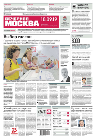 «Вечерняя Москва» — ежедневная российская вечерняя газета, старейшее из вечерних изданий в России, учрежденное в 1923 году. Выходит пять дней в неделю, кроме субботы и воскресенья. Отличается тем, что рассказывает о событиях еще не завершившегося дня. Оперативно освещает хронику и особенности жизни Москвы, охватывает все слои общества и большинство профессиональных и возрастных групп читателей.Издание представлено тремя выпусками – утренним ежедневным, вечерним (выходит три раза в неделю), еженедельным (выходит по четвергам).
