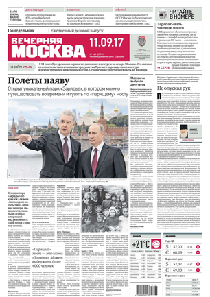 «Вечерняя Москва» — ежедневная российская вечерняя газета, старейшее из вечерних изданий в России, учрежденное в 1923 году. Выходит пять дней в неделю, кроме субботы и воскресенья. Отличается тем, что рассказывает о событиях еще не завершившегося дня. Оперативно освещает хронику и особенности жизни Москвы, охватывает все слои общества и большинство профессиональных и возрастных групп читателей.Издание представлено тремя выпусками – утренним ежедневным, вечерним (выходит три раза в неделю), еженедельным (выходит по четвергам).