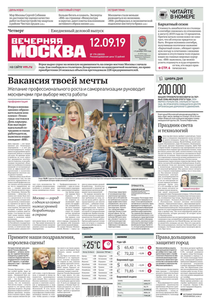 «Вечерняя Москва» — ежедневная российская вечерняя газета, старейшее из вечерних изданий в России, учрежденное в 1923 году. Выходит пять дней в неделю, кроме субботы и воскресенья. Отличается тем, что рассказывает о событиях еще не завершившегося дня. Оперативно освещает хронику и особенности жизни Москвы, охватывает все слои общества и большинство профессиональных и возрастных групп читателей.Издание представлено тремя выпусками – утренним ежедневным, вечерним (выходит три раза в неделю), еженедельным (выходит по четвергам).