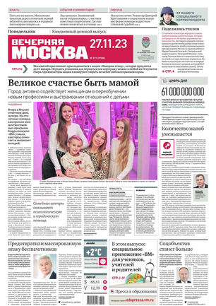 «Вечерняя Москва» — ежедневная российская вечерняя газета, старейшее из вечерних изданий в России, учрежденное в 1923 году. Выходит пять дней в неделю, кроме субботы и воскресенья. Отличается тем, что рассказывает о событиях еще не завершившегося дня. Оперативно освещает хронику и особенности жизни Москвы, охватывает все слои общества и большинство профессиональных и возрастных групп читателей.Издание представлено тремя выпусками – утренним ежедневным, вечерним (выходит три раза в неделю), еженедельным (выходит по четвергам).