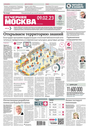 «Вечерняя Москва» — ежедневная российская вечерняя газета, старейшее из вечерних изданий в России, учрежденное в 1923 году. Выходит пять дней в неделю, кроме субботы и воскресенья. Отличается тем, что рассказывает о событиях еще не завершившегося дня. Оперативно освещает хронику и особенности жизни Москвы, охватывает все слои общества и большинство профессиональных и возрастных групп читателей.Издание представлено тремя выпусками – утренним ежедневным, вечерним (выходит три раза в неделю), еженедельным (выходит по четвергам).