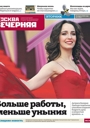 Вечером на страницах «Вечерки» появляются эксклюзивные интервью ньюсмейкеров культуры и шоу-бизнеса, репортажи журналистов по вечерней Москве, афиша нашего города. Один раз в неделю выходит специальный студенческий вечерний номер.