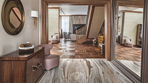 Коттедж находится в ближайшем Подмосковье, в лесу, недалеко от водохранилища. Дома здесь деревянные, заборов нет, и архитекторам нужно было создать особенный интерьер, который бы соответствовал стилистике застройки посёлка и самому месту. «У меня почти сразу возникли ассоциации с классическим американским коттеджем, домом в стиле Хэмптонс,—поясняет замысел Мария Бахарева.—Близость к воде, неспешная и размеренная жизнь вдали от мегаполиса— всё это повлияло на выбор художественного решения: лаконичный, сдержанный интерьер, базирующийся на стилистике американского ар–деко, но в более лаконичном прочтении, при этом тёплый, уютный, с тактильно приятными фактурами. Показательный элемент в этом плане—лестница в стиле ар–деко. Её лёгкие и тонкие балясины с латунными вставками коррелируют с архитектурой дома, в интерьере мы активно использовали текстуру американского ореха и древесину в сближенных оттенках: модульный паркет, столярные изделия, двери с фацетированным стеклом и бронзовыми деталями, сделанные по нашим эскизам на заказ. Всё это формирует визуальный облик интерьера, по‑мужски строгий и лаконичный. Заказчики—семейная пара, муж и жена. Их дети выросли и живут отдельно. Кстати, это не первый наш опыт работы с этими заказчиками. Один из их проектов публиковался в журнале Salon‑interior».