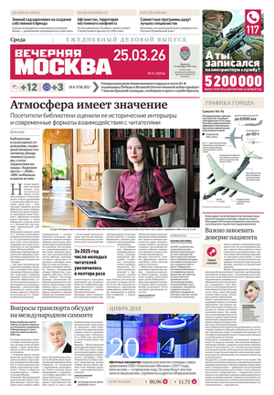 «Вечерняя Москва» — ежедневная российская вечерняя газета, старейшее из вечерних изданий в России, учрежденное в 1923 году. Выходит пять дней в неделю, кроме субботы и воскресенья. Отличается тем, что рассказывает о событиях еще не завершившегося дня. Оперативно освещает хронику и особенности жизни Москвы, охватывает все слои общества и большинство профессиональных и возрастных групп читателей.Издание представлено тремя выпусками – утренним ежедневным, вечерним (выходит три раза в неделю), еженедельным (выходит по четвергам).